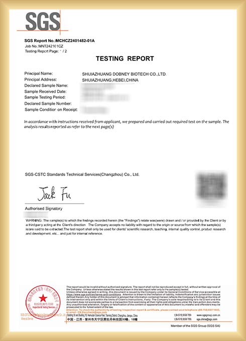 - Dobney-biotech strictly controls the qualities of products to meet the standard. Under ISO 9001:2015 standard and Good Manufacture Practice System (GMP Standard), the final products of Dobney-biotech are required to undergo strict quality checks corresponding to FAO specifications.